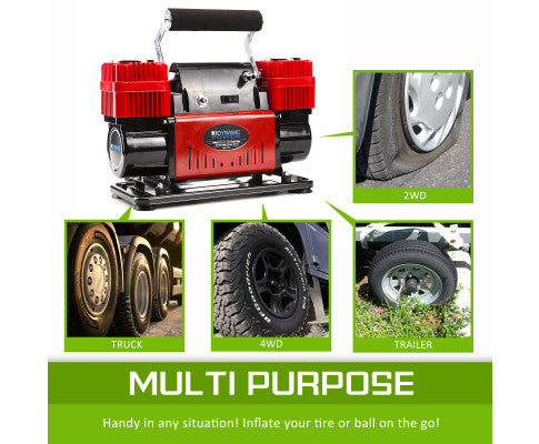 This Dynamic Power 12V 300L/M 220PSI Heavy Duty 50mm Cylinder Portable Air Compressor is a must have if you are an off-road enthusiast! The handiness and quality will sure impress you when you most need it on those emergency situations! If you have a puncture, do not worry, it also comes with an emergency repair kit so you can keep going on your journey!